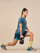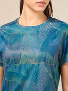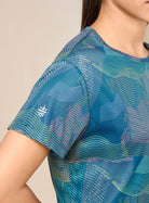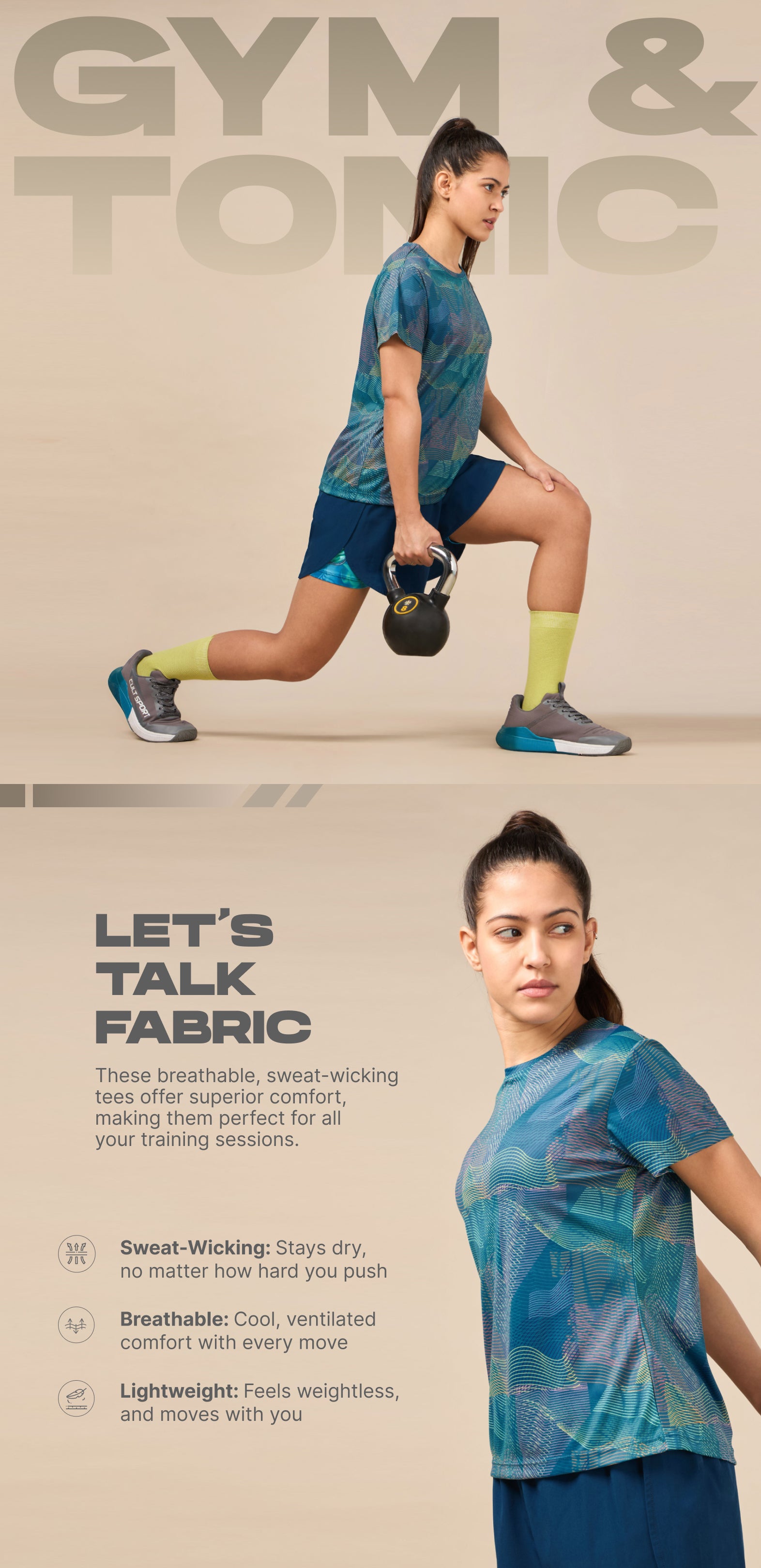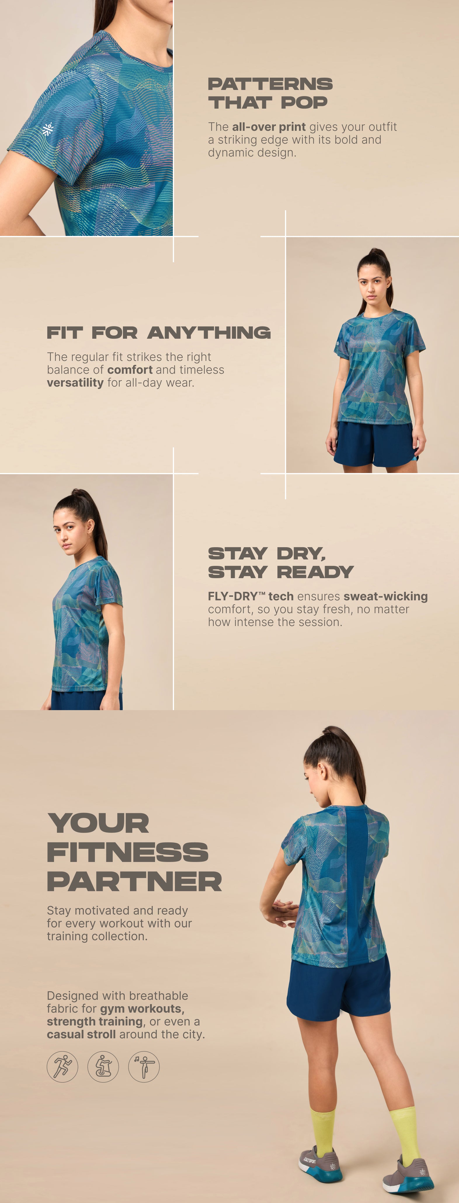Train in comfort with the Women's Blue High Energy Line Training T-shirt. Crafted with sweat-wicking fabric, it quickly pulls moisture away from your skin to keep you dry and comfortable. The breathable back panel ensures maximum comfort during any workout. With an all-over print and a regular fit, this T-shirt combines performance and style.