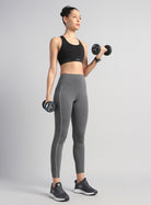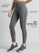 Power through every move in the Women's Dark Grey Train and Flow Cotton Tights, designed for comfort and performance. Made with soft cotton-lycra that offers gentle softness that flexes with you. The compression fit supports muscles for energised movement, while the anti-slip high waistband ensures a secure hold. The side pockets keep essentials close during every session.