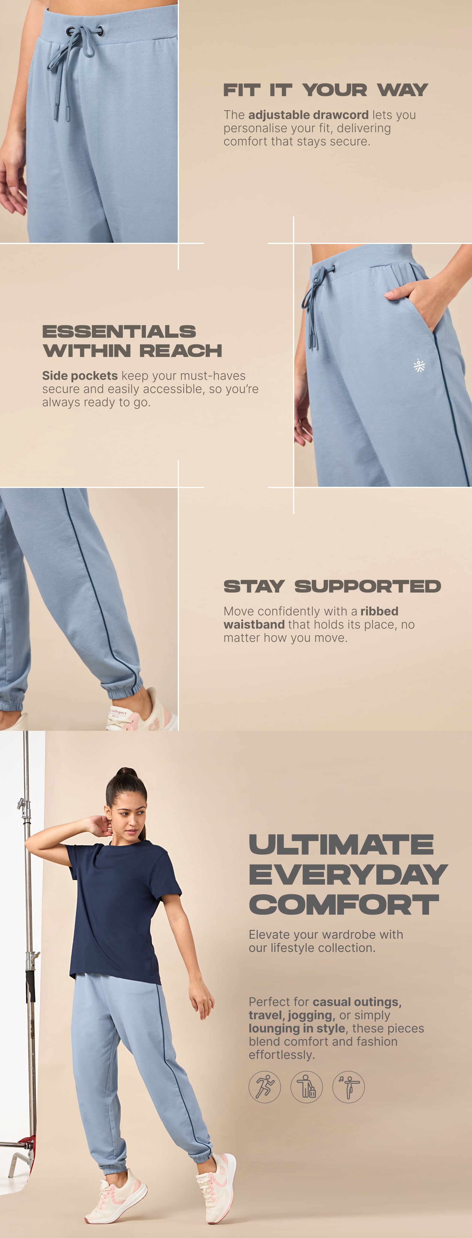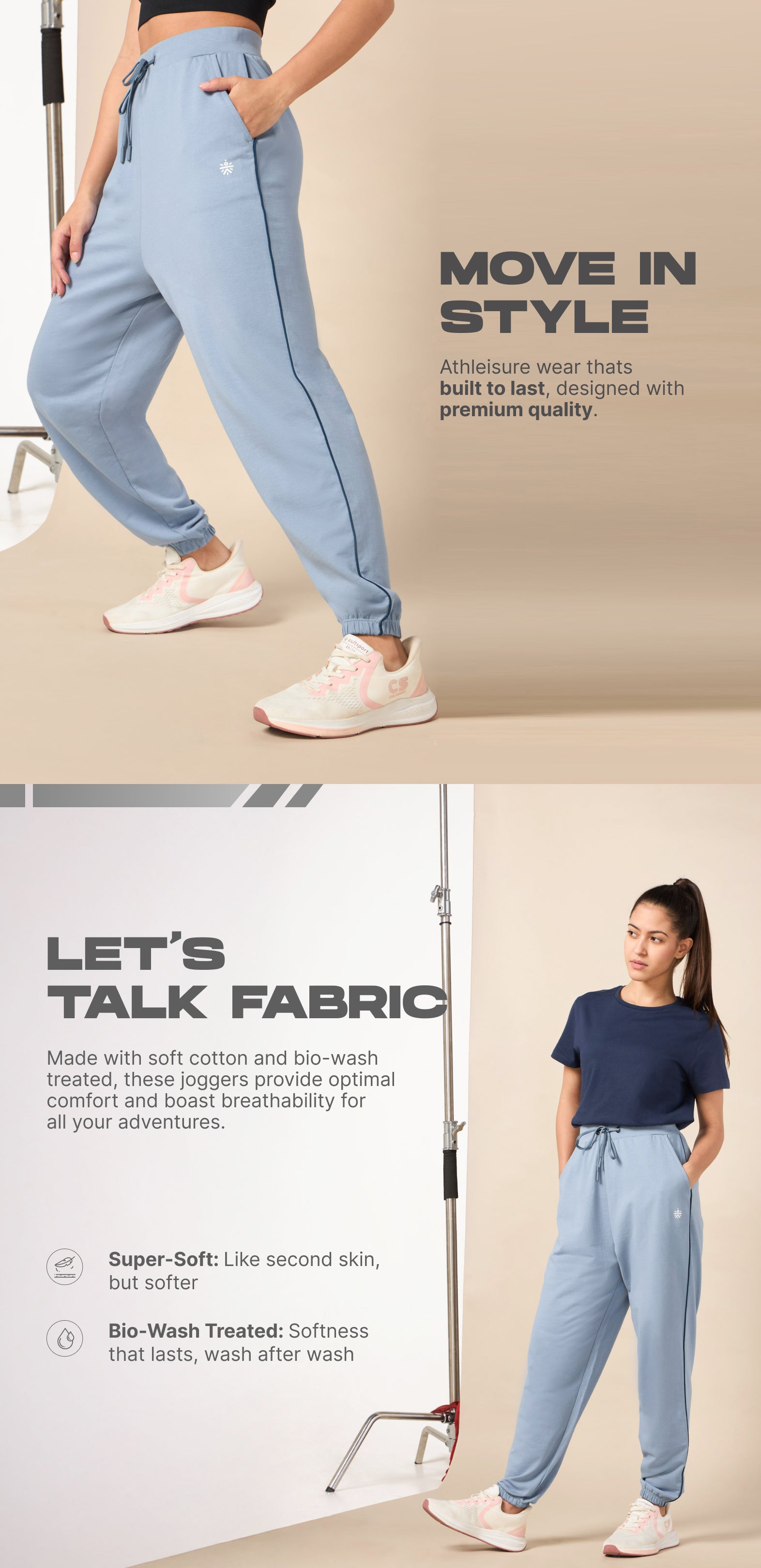 Step into comfort with Women's Light Blue Relaxed Joggers. Made with 100% super-soft combed cotton, offering a smooth and cosy feel against your skin. Features an adjustable drawcord for the perfect fit, elasticated cuffs to keep it snug, and side pockets for all your essentials. These joggers are built for ultimate relaxation and style.