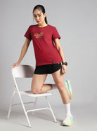 Make everyday moves feel effortless in the Women's Maroon Sporty Graphic T-shirt. The super-soft fabric delivers a smooth, easy feel that stays comfortable all day. The ribbed neckband adds structure for a neat finish, whilt the regular fit allows relaxed movement without losing shape. The high-density print adds a bold, long-lasting touch that elevates the look.