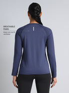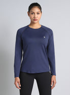 Crush every rep in the Women's Navy Build Up Performance Recycled Poly T-shirt, designed for comfort and agility. The FLY-DRY™ tech wicks sweat for quick-dry performance. Crafted from recycled materials for soft, eco-conscious comfort, the super-stretch fabric allows full range of motion. The breathable panel enhances airflow, while the raglan sleeves offer unrestricted movement.