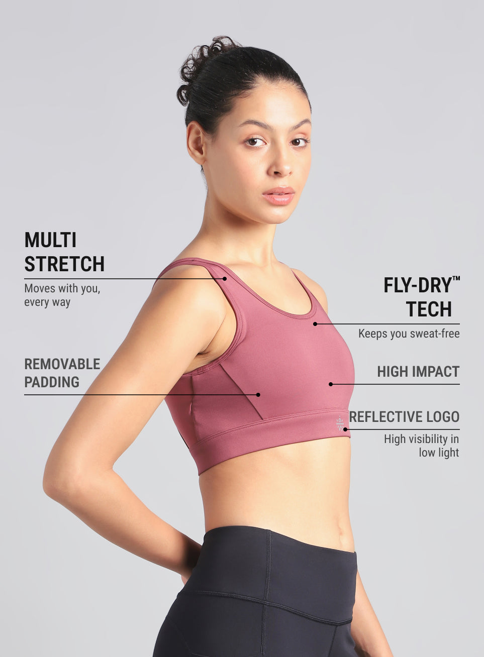 Bring the power to every move with the Women's Pink AOP Cross Over High Impact Bra, designed for performance and style. Made from FLY-DRY™ fabric that’s lightweight and helps wick away sweat to keep you cool. Features a criss-cross back for flexible support and removable padding for a customisable fit. Designed for high-impact activities, this sports bra is perfect for all your high-intensity workouts.