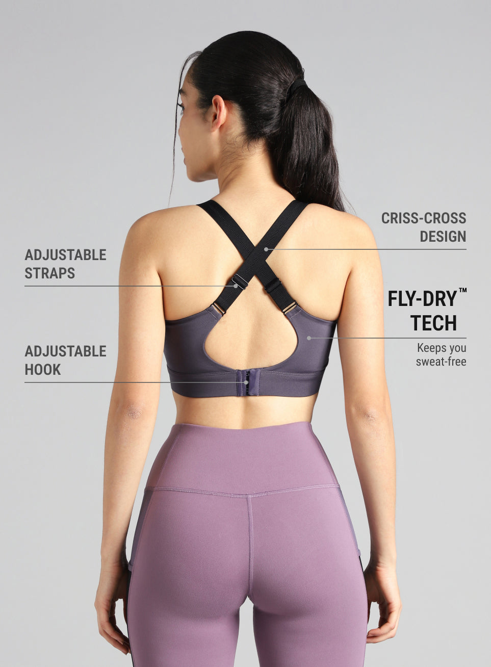 Run wild with the Women's Purple High Impact Running Bra built to keep pace. The FLY-DRY™ tech wicks sweat away to keep you cool through demanding runs. The multi-stretch fabric adapts to your movement for flexible comfort. The high-impact support stabilises bounce even at high intensities. The removable padding offers adjustable coverage, while the adjustable straps help dial in a precise, run-ready fit.