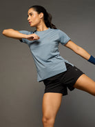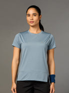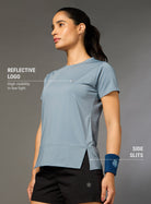 Step up your stride with the Women's Sky Blue Forward Motion T-shirt! Designed with lightweight, breathable fabric, it keeps you cool and comfortable during every run. Side slits add flexibility, while the reflective logo ensures visibility during low-light conditions.