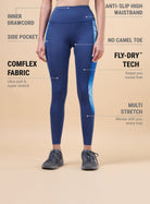 Step into unstoppable comfort with the Women's Navy Energy Map Printed COMFlex Tights! Made with COMFlex fabric, they offer cloud-like softness and flexible stretch for all-day ease. The multi-stretch design moves with you through every session. The anti-slip high waist provides a secure fit, while the inner drawcord offers extra support. The side pocket keeps essentials within reach.